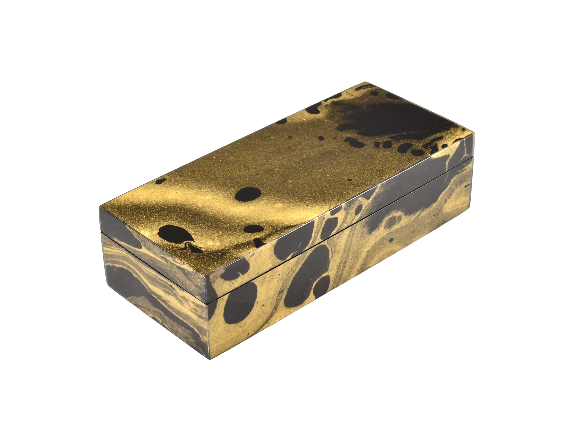 Pencil Box: 9" x 4" x 2" H, Black Gold Marble Paper Inlay with Lacquer Finish.