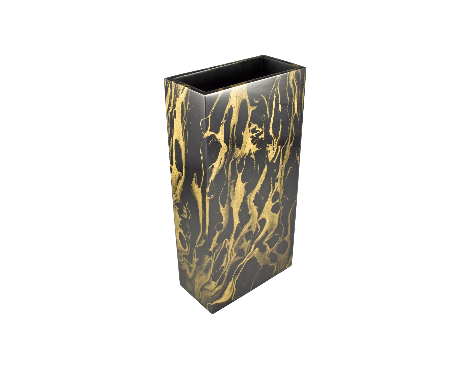 Flower Vase: 8" x 4" x 16" H, Black Gold Marble Paper Inlay with Lacquer Finish.