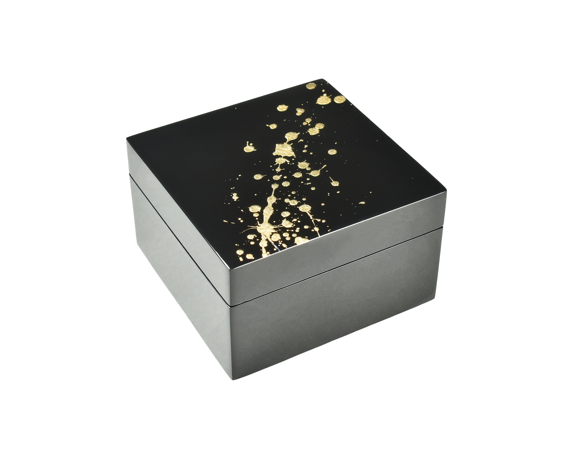 Square Box: 5" x 5" x 3" H, Black with Artful Gold ( Shine Gold Leaf ) with Lacquer Finish.