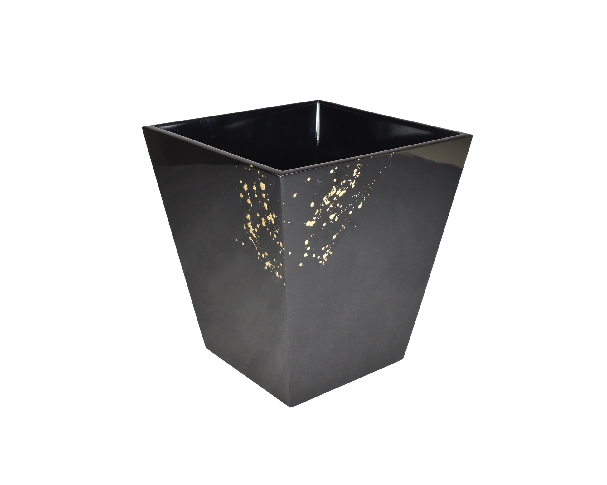 Wastebasket: 9" x 9" x 10" H, Black with Artful Gold ( Shine Gold Leaf ) Lacquer Finish.