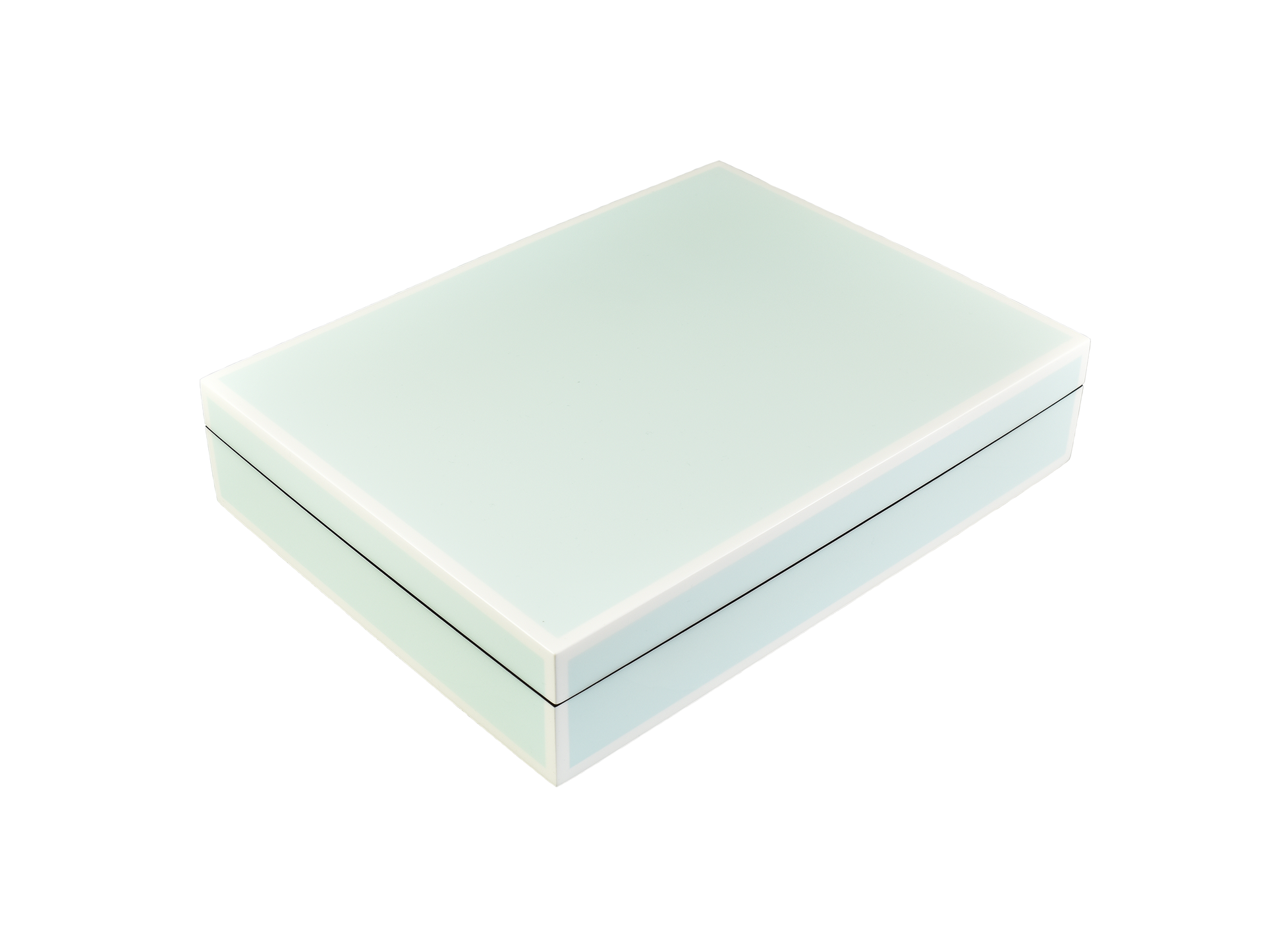 Stationery Box: 12.5" x 9.5" x 2.75" H, Five Side Duck Egg Blue with White Trim Lacquer Finish.