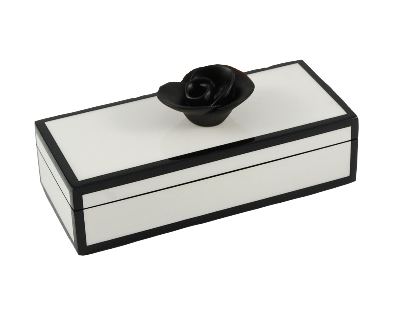 Handle Pencil Box: 9"X4"X2.5"H, Five Side White with Black With Resin Black Flower Handle