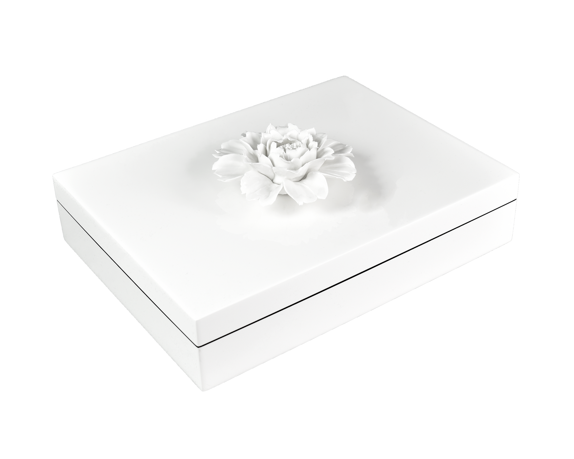 Stationery Box: 12.5"X9.5"X2.75"H, White with Porcelain White Flower Handle