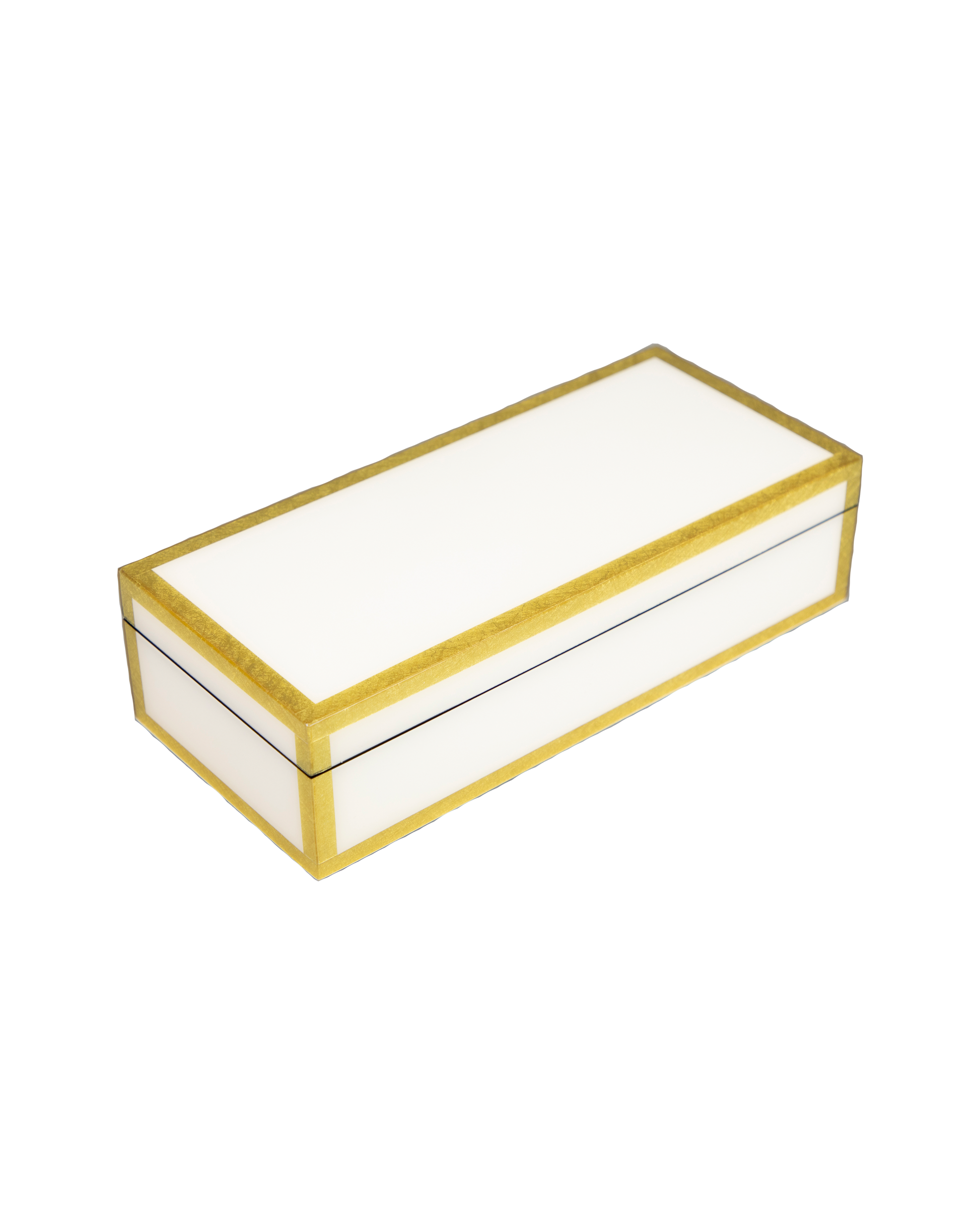 Pencil Box: 9"X4"X2.5"H, Out side Five Side White with Shine Gold Leaf Trim. Inside Black with Black Lining. Hand Polished Lacquer.