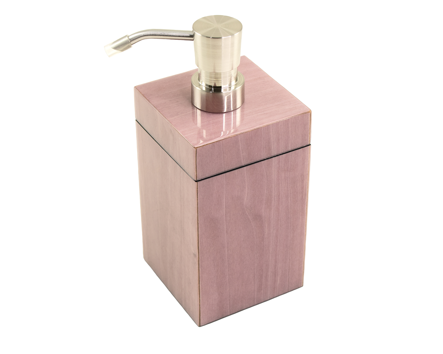Lotion Pump: 3" x 3" x 5" H, Purple Tulipwood Lacquer Finish with Silver Pump and Glass Bottle.