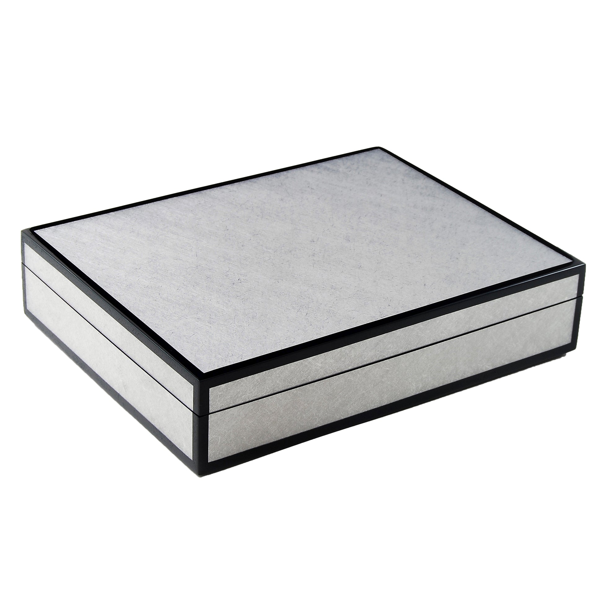Stationery Box: 12.5" x 9.5" x 2.75" H, Five Side Shine Silver Leaf with Black Trim Lacquer Finish.