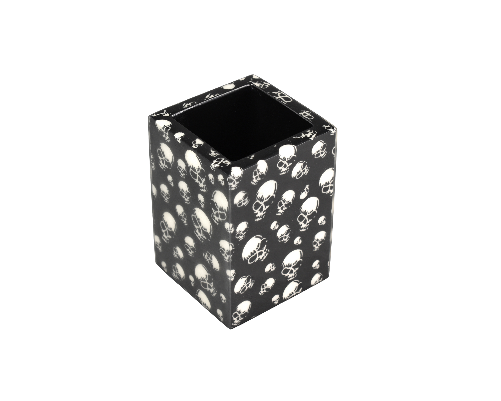 Brush Cup: 3" x 3" x 4.5" H, Skulls Fabric with Black Lacquer Finish.