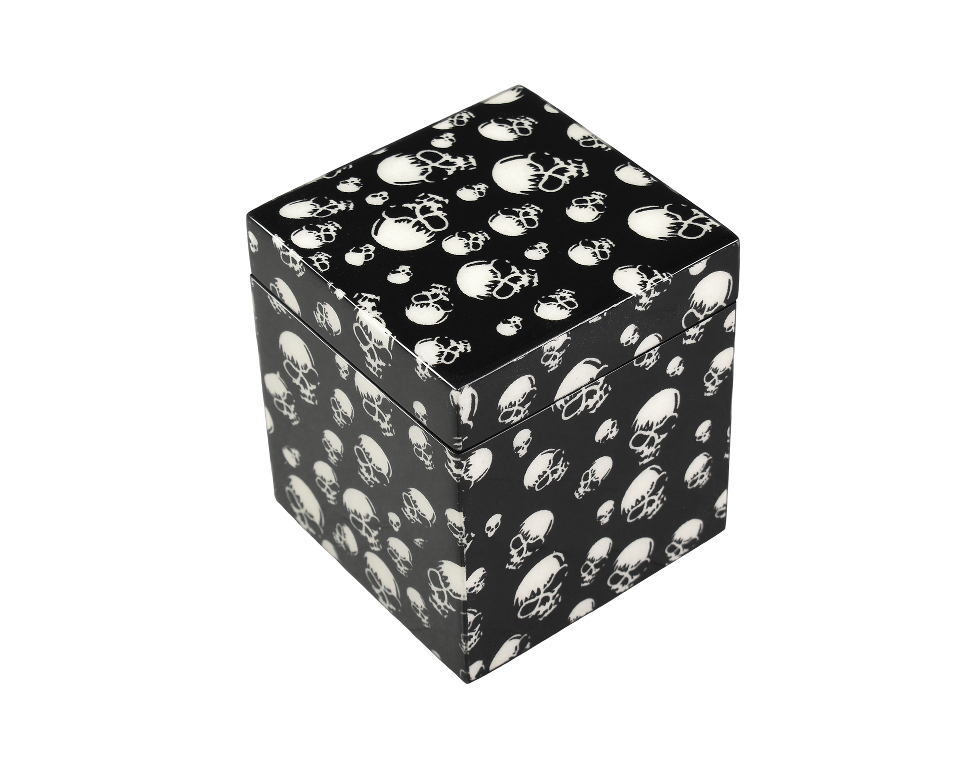 Q Tip Box: 3.5" x 3.5" x 4" H, Skulls Fabric with Black Lacquer Finish.