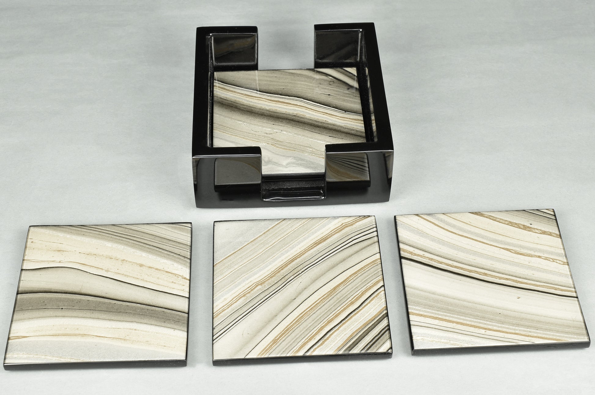 Tucson Paper Inlay with Lacquer, Set of 4 Square Coasters with Holder