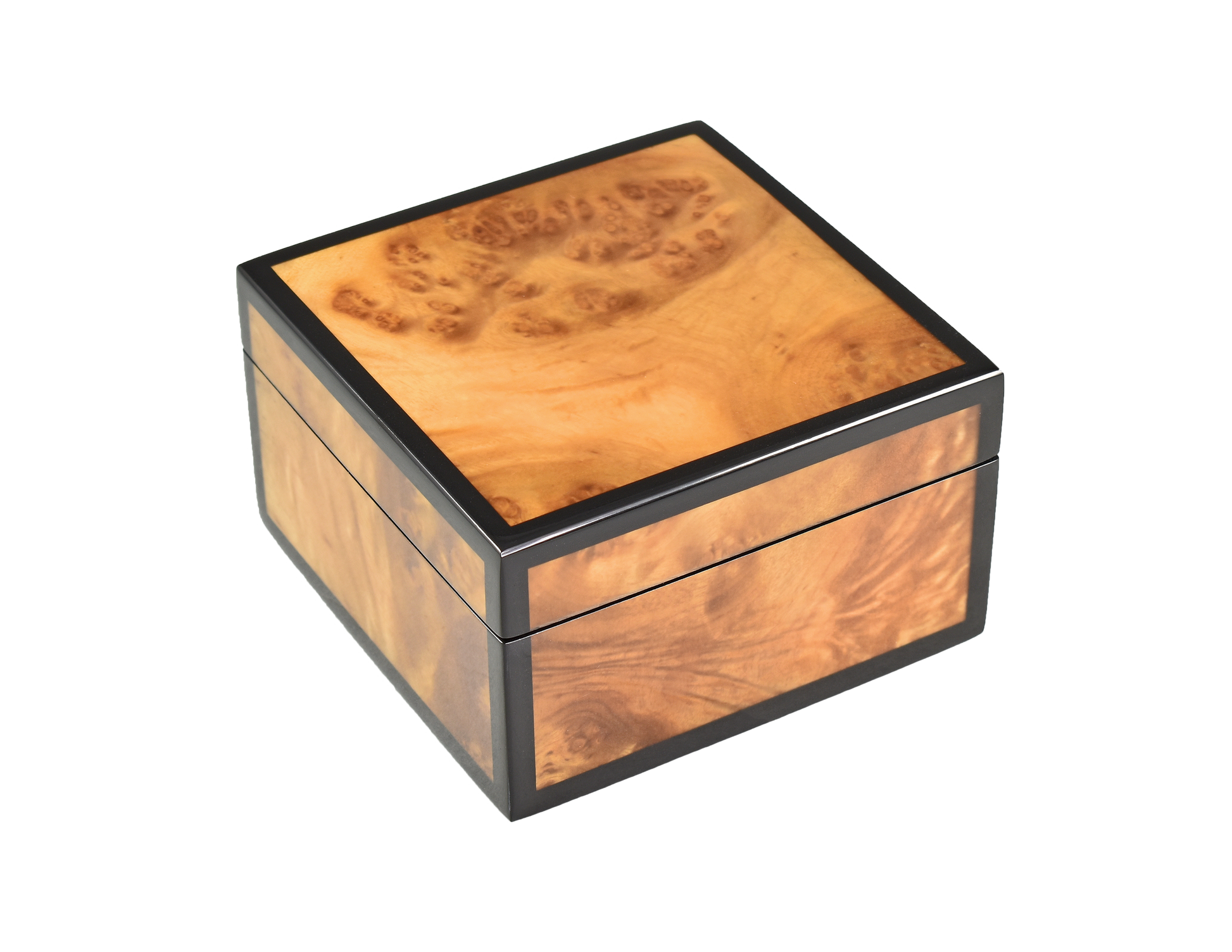 Five Side Walnut Burl with Black Trim Lacquer Finish.