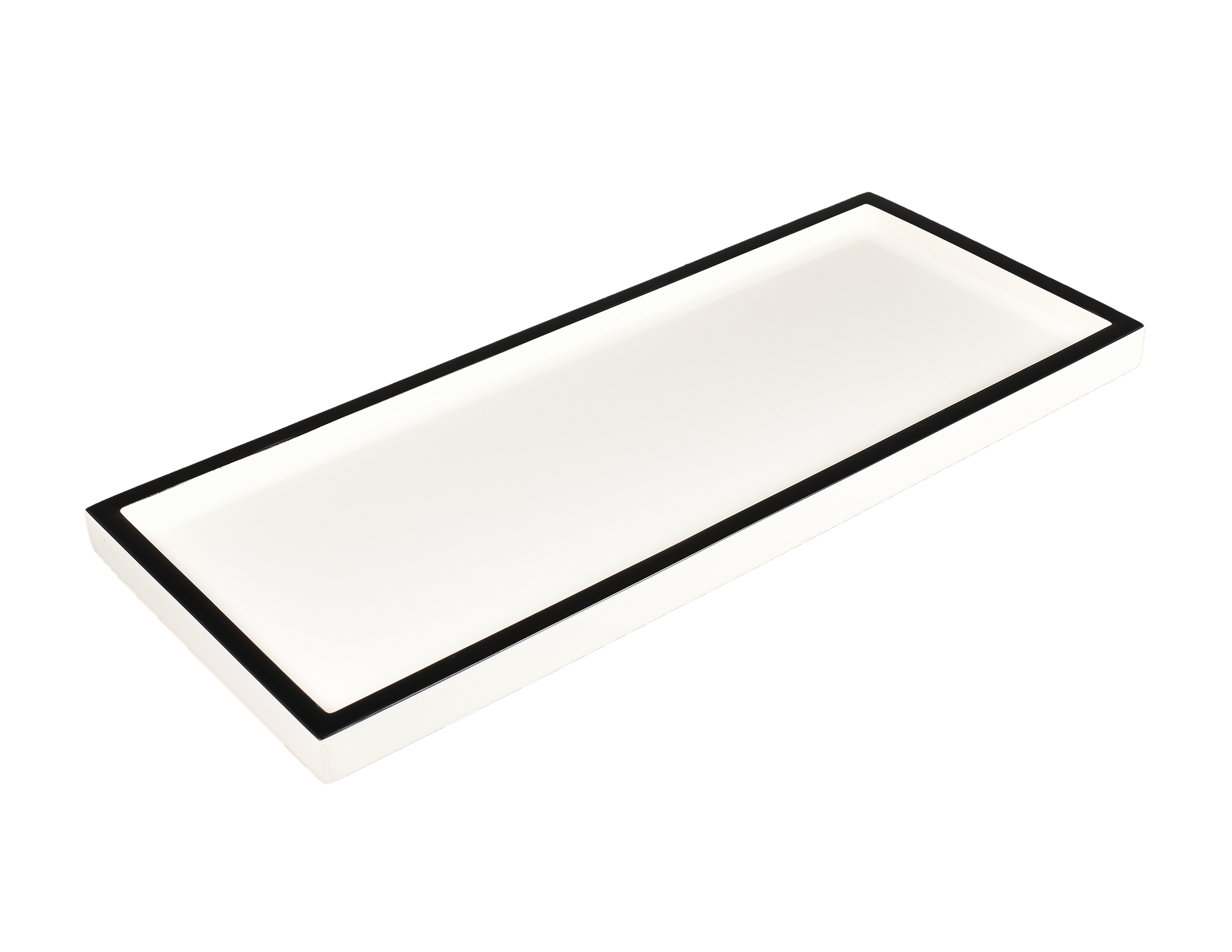 Long Vanity Tray: 7" x 17" x 1.5" H, White Lacquer with Black Trim Lacquer Finish.