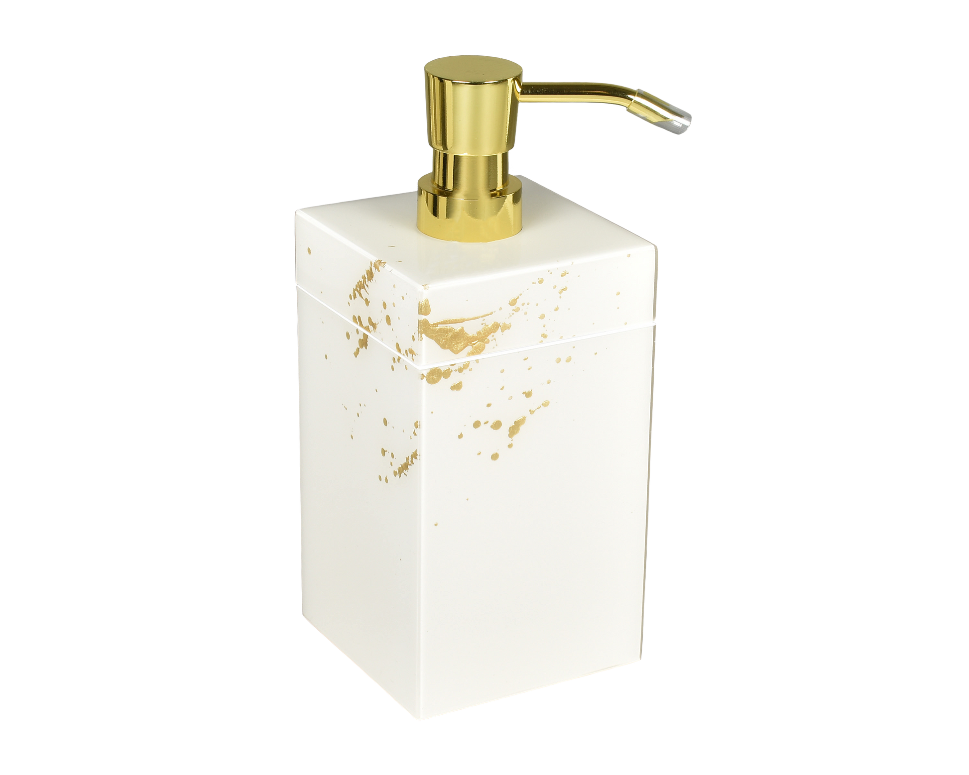 Lotion Pump: 3.5" x 3.5" x 5" H, White with Artful Gold ( Shine Gold Leaf ) with Lacquer Finish. Glass Bottle , Gold Pump.