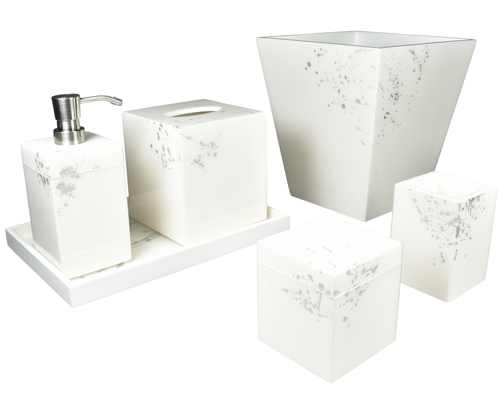 Lotion Pump: 3.5" x 3.5" x 5" H, White with Artful Silver ( Shine Silver Leaf ) with Lacquer Finish.